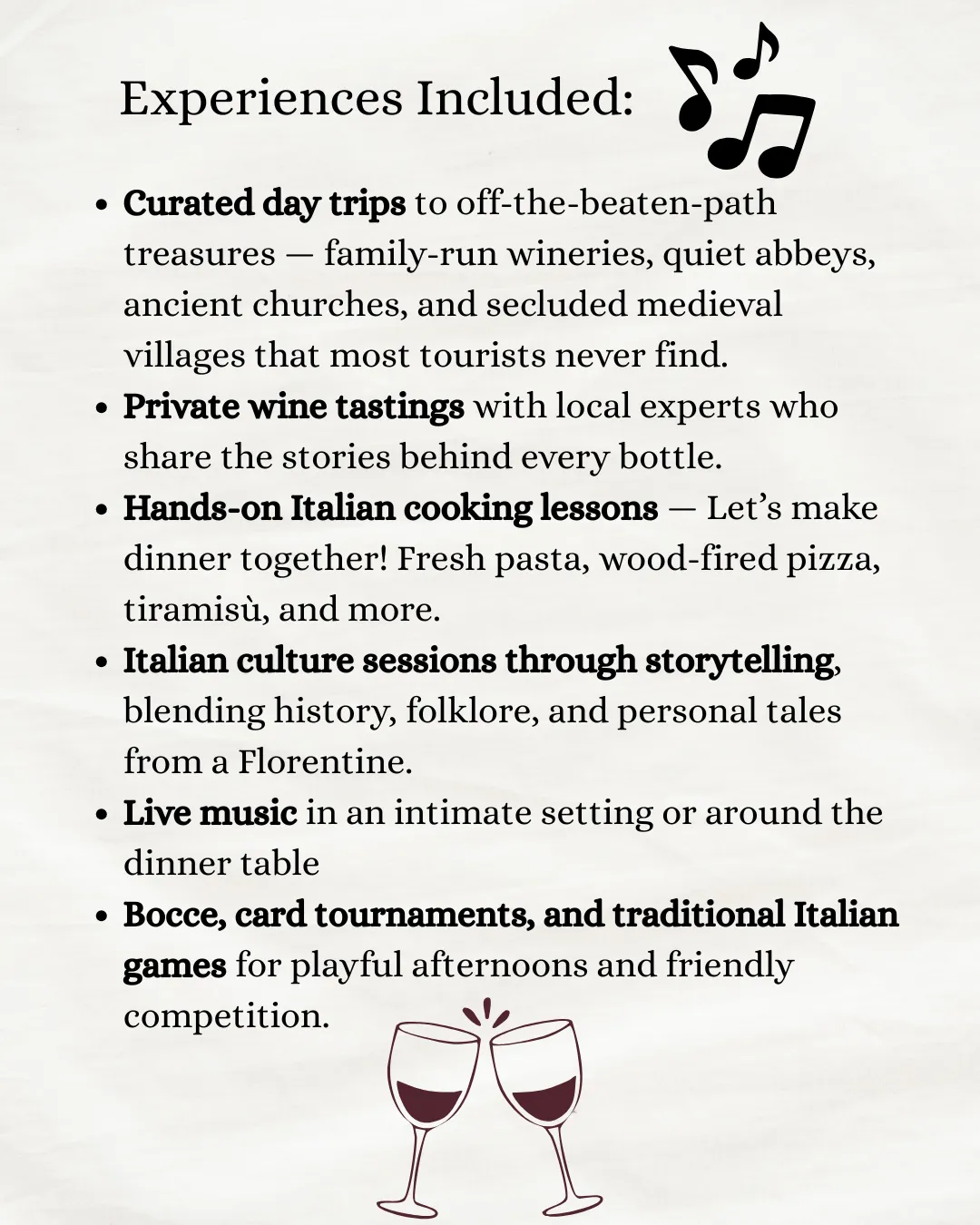 Alcoholic beverages(Wine is provided with dinner; additional drinks are at your discretion.)